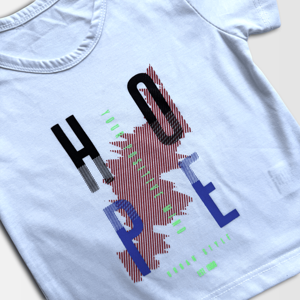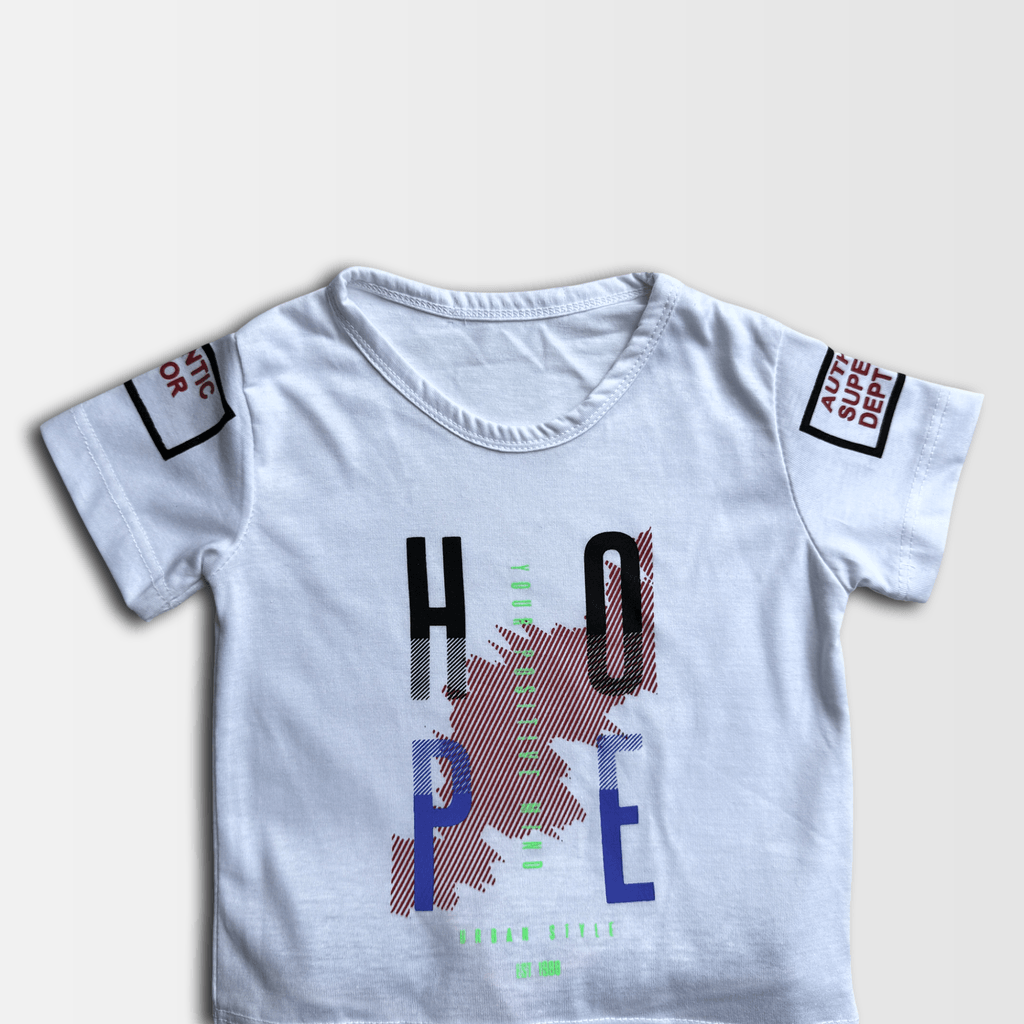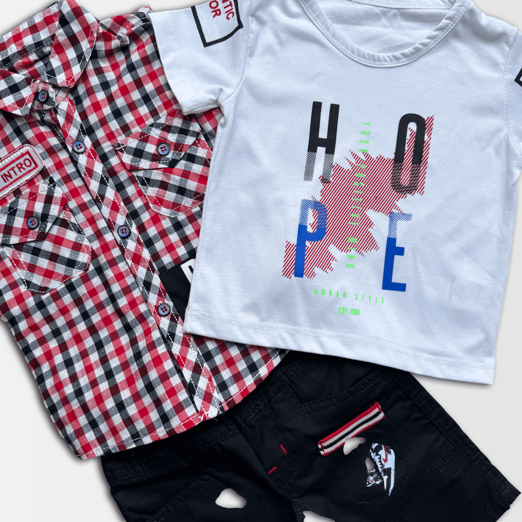 The layered look gives the illusion of a short-sleeve checkered shirt over a white t-shirt — very trendy for kids.